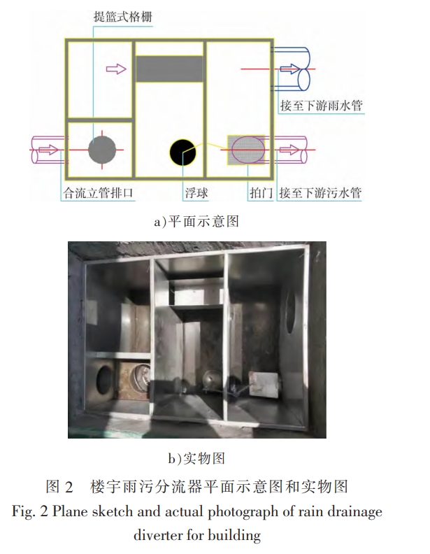 樓宇雨污分流器(見圖2)是針對混接排水立管分流改造的一體化設(shè)備,設(shè)置在排水立管末端,一般埋地安裝。其本質(zhì)是在槽堰結(jié)合式截流井的基礎(chǔ)上,增設(shè)微型提籃式格柵來除渣以免堵塞,增設(shè)浮球控制的拍門削減雨天較清潔的排水進人下游污水管。設(shè)備使用前需調(diào)查混接排水立管接入情況,嚴禁馬桶或蹲坑污水接人,以免較大雜物堵塞進水口使其功能喪失。另外,由于上游管道基本沒有調(diào)蓄容量實際使用中瞬時排水量較大時,容易造成污水溢流進入下游雨水管。