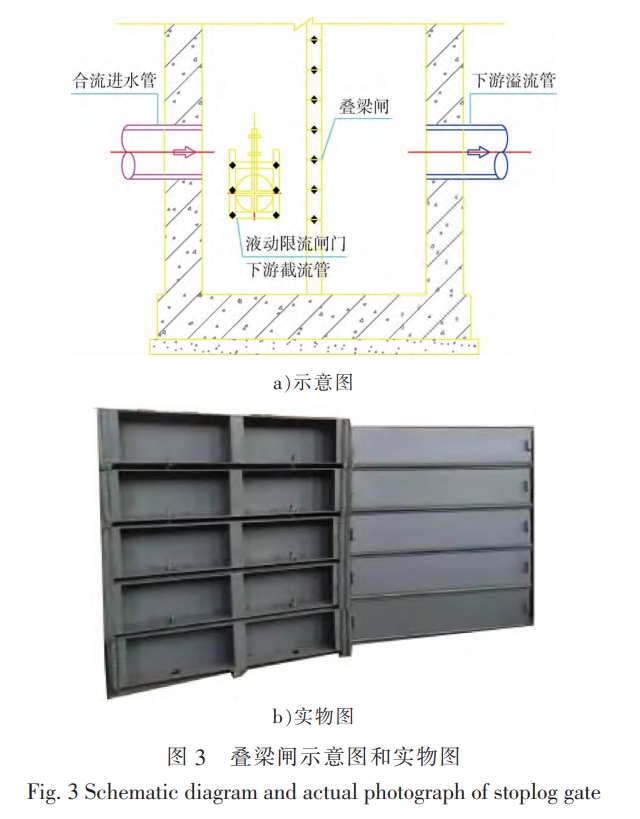 采用由多塊閥板組成的疊梁閘(見圖3)替代固定堰高堰墻,設(shè)置鋼絲牽引疊梁閘,四周采用止水膠條封堵,打開或閉合不同數(shù)量的閥板以實現(xiàn)截流量的調(diào)配,用以適配不同降雨歷時或暴雨強度的降雨。疊梁閘較傳統(tǒng)堰式截流井使用更加靈活,但存在滲漏問題。