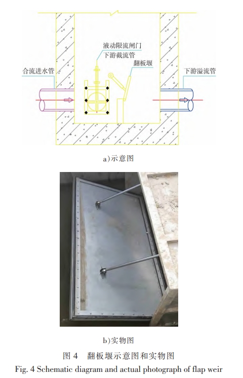 采用翻板堰(見圖4)替代固定堰高堰墻,堰系統(tǒng)配有傾角儀和上、下限位開關(guān),設(shè)定井內(nèi)警戒液位,采用液位儀監(jiān)測堰門前井內(nèi)液位和堰門后自然水體液位。當(dāng)井內(nèi)液位大于警戒液位且至少大于自然水體液位0.1m時,翻板堰由閉合狀態(tài)變?yōu)殚_啟狀態(tài),開啟角度可以調(diào)節(jié),進而控制出水管方向的流量。翻板堰主要適用于小排口截流改造。
