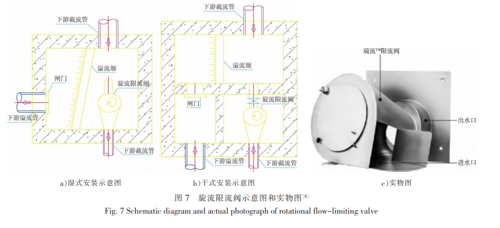 在傳統(tǒng)堰式截流井內(nèi)截流管前端安裝旋流限流閥,使進水經(jīng)過旋流限流閥后進入截流管。旋流限流閥工作時利用其腔體內(nèi)外的進水壓力差,使得進水以正切角的方向切入腔體,能精確控制截流量,截流污水能均勻穩(wěn)定地排放至下游構(gòu)筑物。旋流限流閥上游需設(shè)置必要的攔污設(shè)施,保證閥體正常運行。